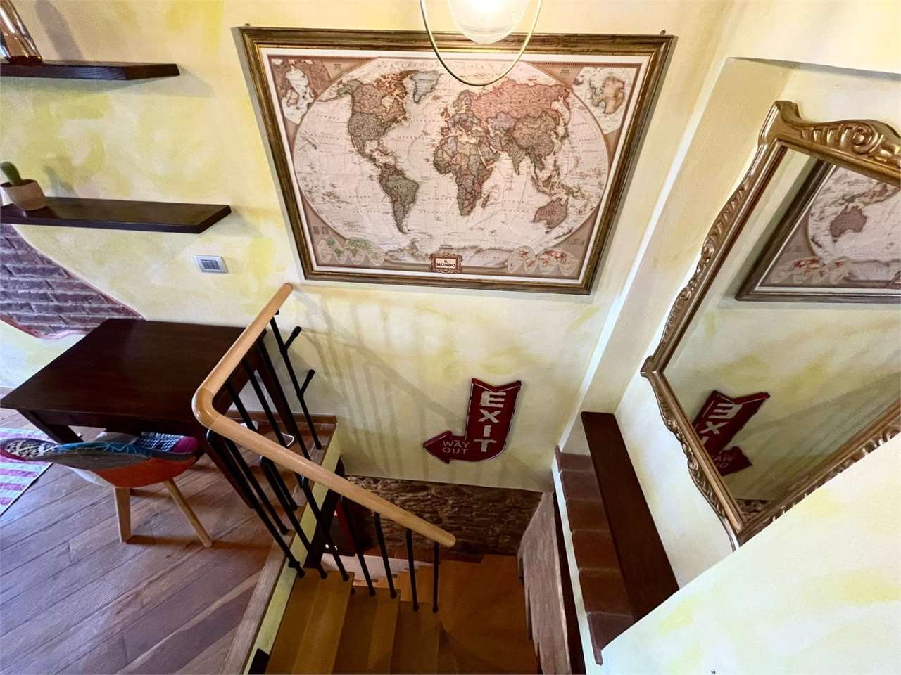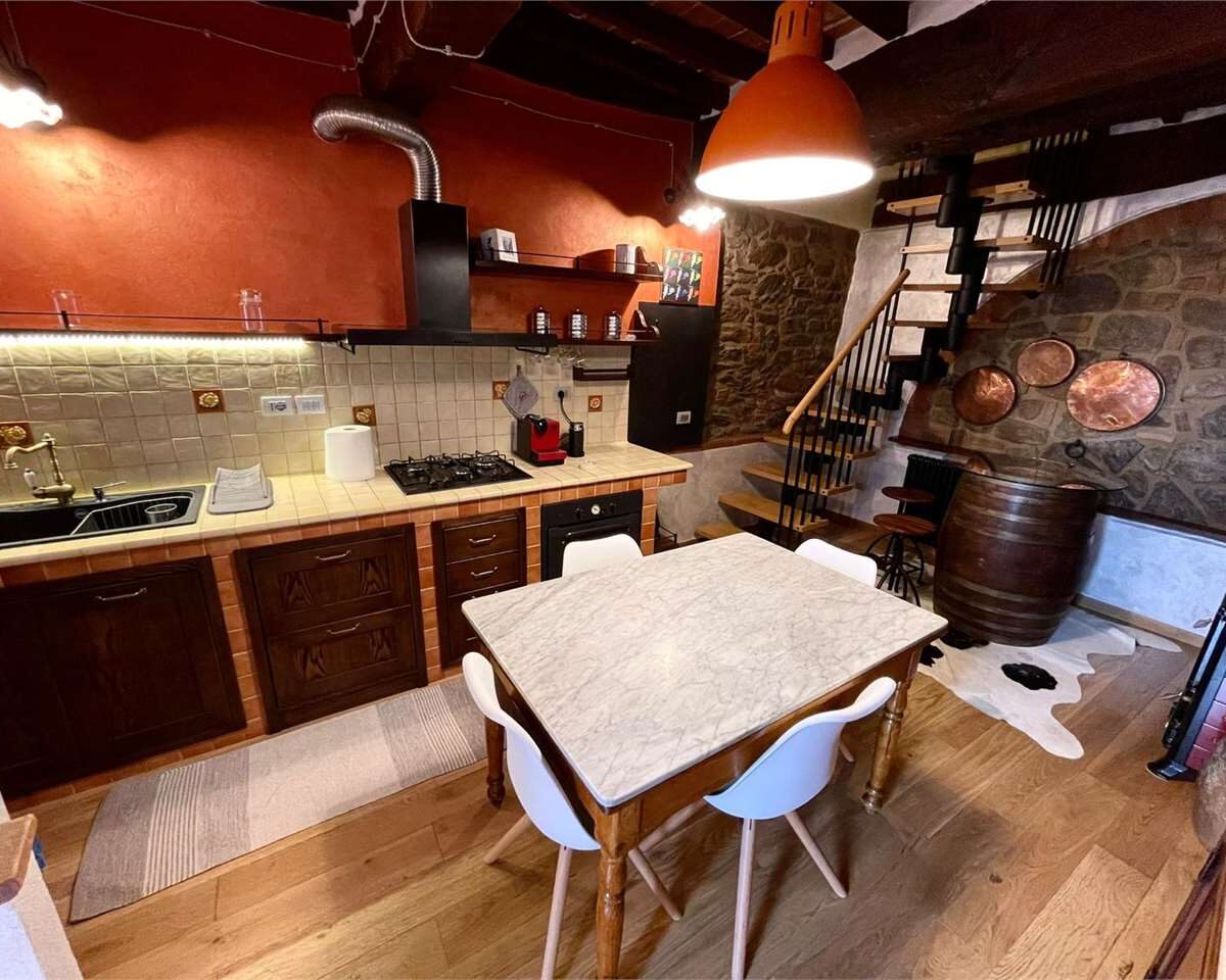 Ingresso al piano terra dove troviamo una cucina abitabile con stufa a legna e accesso al chiostro, un bagno di servizio, un vano ad uso lavanderia. Al primo piano ci accoglie un salotto con caminetto e una bella vista panoramica sulla Valdichiana oltre a due camere da letto ed un bagno con finestra e doccia.